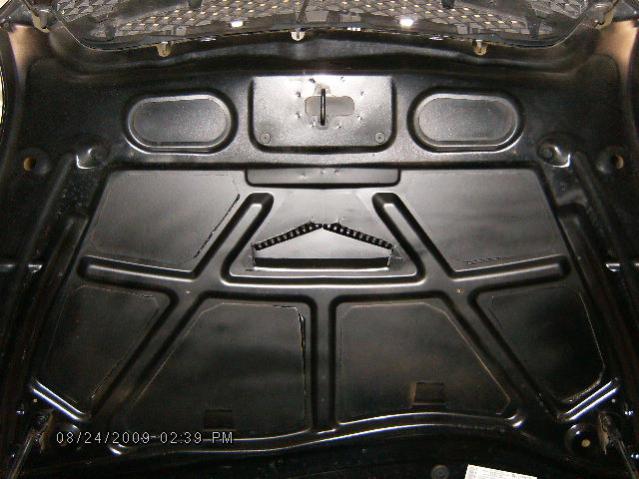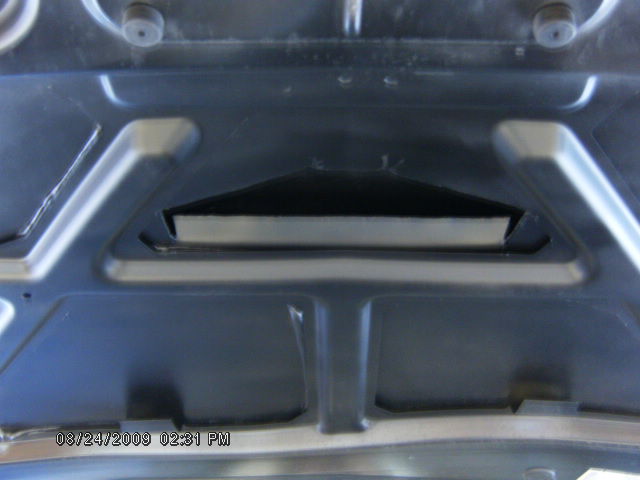 The whole cut out was not removed, I left a 1 1/2 " flange that was bent to force the air over the engine. Right now about 3/4 of the pasengers side scoop is directly over the uncovered air box, I'd like to have tubing runing rite off the scoop holes to a customized air box, The yellow grills in the scoop will probally not make it in my final design.