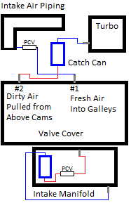 While I'm guessing we could plumb the two systems together into 1 can. Again, trying to Keep It Simple, this setup is basically stock. All I'm doing is making it external and installing catch cans where dirty air comes out.