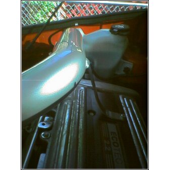 The hardest part of the whole install was adapting the support bracket so it fit my 2.2L engine. No vise was available, so I used my boyfriends 2 ton hydraulic jack, putting the support bracket in between the metal sides and was able to bend it to nearly straight. Then took a hammer and large brass round thing (don't know wtf it is) and pounded out the original bend until it was nearly flat. Then put it back into the jack and made the new bend, so it would sit where it needed to under the hood.