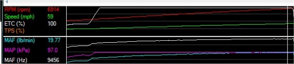 This is a pull with the OEM intake going above the factory redline. In the lower area, the purple line represents the manifold pressure. At full throttle, it flatlines all the way up. If it were in any way restrictive, manifold pressure would drop in the upper air demand regions. It does NOT!!