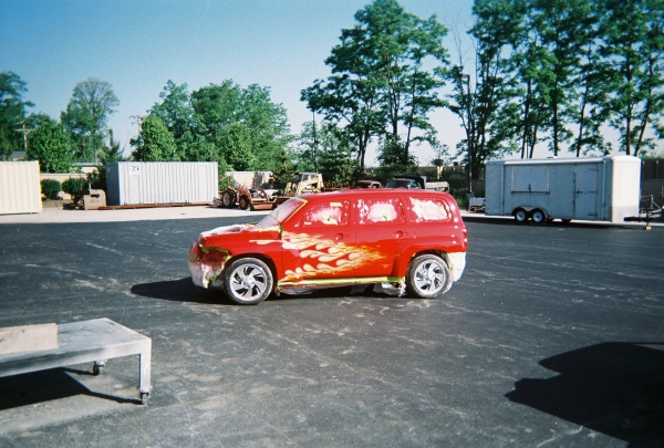Holy Moly! Tell me more - did you start with a red car, was it intact or did you buy it used or was this your baby you pulled apart?? LOVE your pin-wheels!! In the last photo, what is the white stuff that looks like wax on the hatch and above the left-side tail lights? Boy, I'm full of questions, like .... what flames??