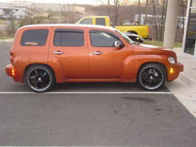 The wheels are zinik adrians, and i move up o 18" from 17". they are about a 1/4 inch smaller than the stock wheel and tire combo so i need to lower the car a bit to get the stance i'd like. the new tires are 225-40-18's. I found the wheels in a catalog and the shop and had to order them ( shop said the wheels were blank and would have to be drilled to accomodate the hhr's bolt pattern but the offset matched) took a week to get them in! Now i've got to order my grille! :)