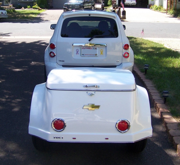 I love the way the tail lights match the HHR and the fact that those behind can see all the taillights together. Can you see the trailer when backing up? What does it weigh and how much weight can you put in it? Are the wheels and tires the same size as the HHR? If so, you got a full size spare there and you can take that little one out of your trunk. That will give you more storage space inside!
