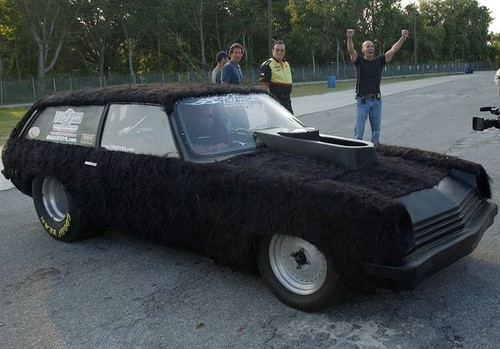was a Vega station wagon covered in Long brown hair looking material all over it.. Quick machine as well...
