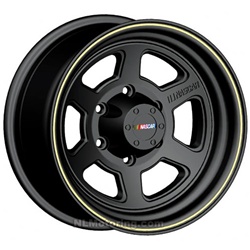 You could get some of these Nascar replica wheels. They're flat black with a red stripe on the lip, but they do say "Nascar" on one of the spokes and centercap...