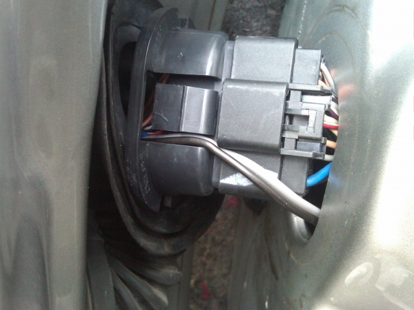 At the hinge pillar area, where the rubber grommet interfaces with the body, is a large 20 conductor connector. A similar mating connector attaches from the door side.