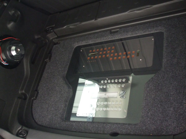 Some of the best features are that the factory floor panel fits over the top of all this and I still have a fully functional hatch area and I can still easily access my spare tire in case of an emergency. I’ll post more pics when I finish with the front horns. I did some small mods as well, like add an extra lighter jack in the hatch and changed the antenna from Onstar only to Onstar/Satellite for use with my Sirius radio. I also added Bluetooth capability to the factory radio via a Parrot LS-3200.