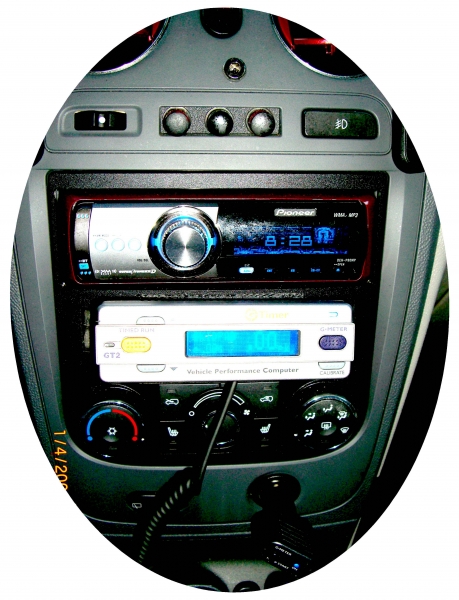 I never liked using the suction cup mount on the windshield. The meter is too far, the cord hangs across the whole dash, and it looks suspicious to any passing cops. So, I made a simple to use bracket out of wood that slides into the slot under my radio. The wood is a precise fit, and strips of velcro above and below make it very secure.