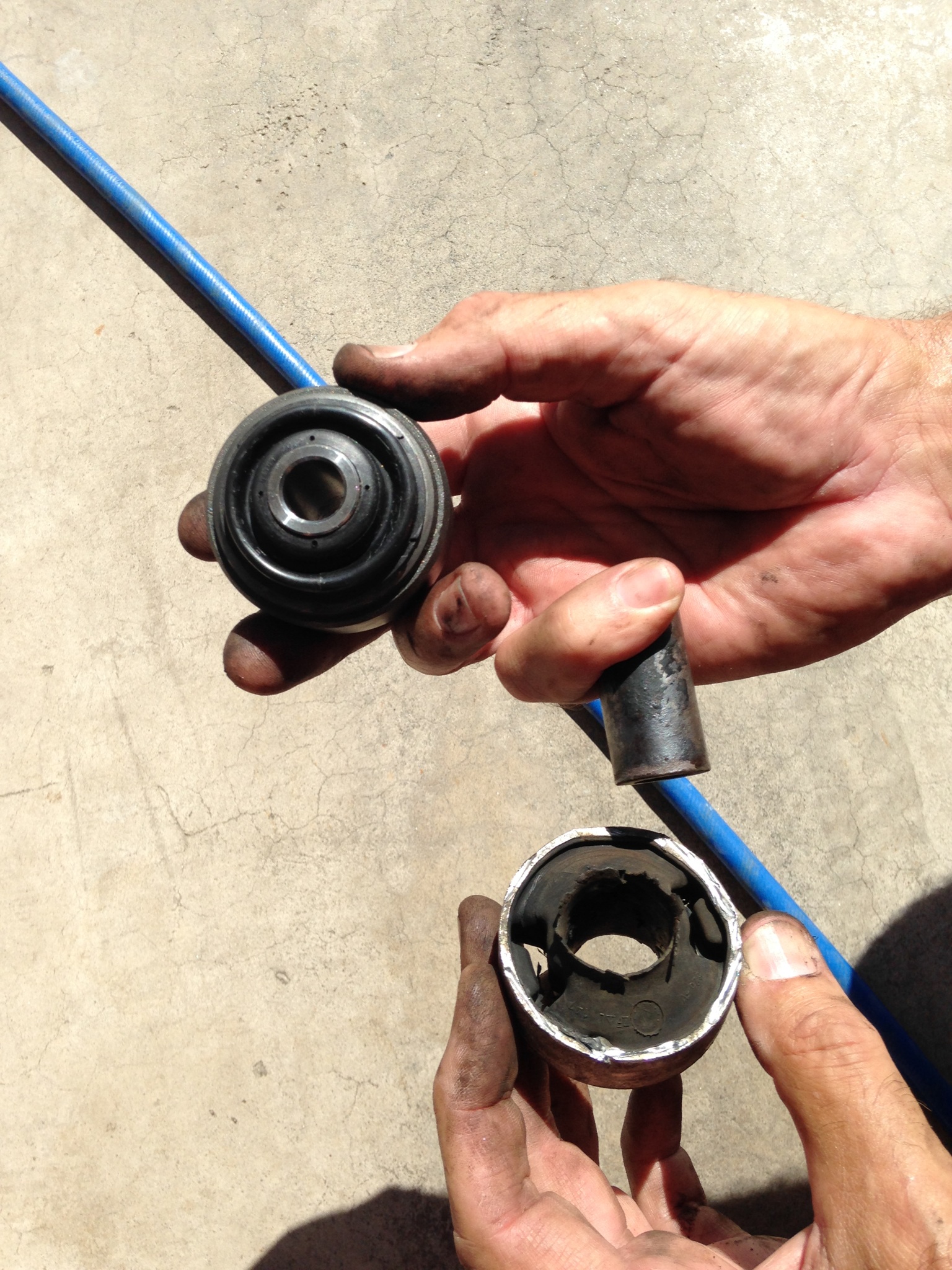 LCA bushings press out the old press in the new! You can see the deterioration on the two piece OEM part on the right