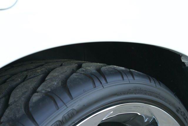 I took some pictures of her car today, 2800 miles have been put on the HHR since the lowering. Sorry for the quality of the pictures but I used her camera. The car is driven daily and has had 3 people at one time and no rub marks on the rear tires. If i had not trimmed the rear fenders the tires would have been cut up pretty good. Here are some pictures of each side.