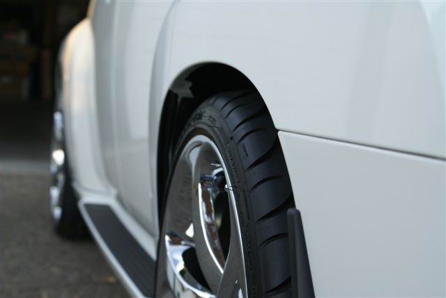 I finished a female friend of mines HHR today. I started with a set of Eibach springs, didn't want to go real low. Was limited on the wheels with a 5x110 bolt pattern so she decided to go with these hub centric 20x8.5 with a 35mm offset. As for tires we went with the BF KDW2 245/30/20, they have a 300 treadwear. Rear outer fenders where rolled just in case, don't want to cut up the new tires. I was suprised with the ride, not bad at all! All in All she is very happy and I enjoyed doing it for her. Oh! can't forget the stubby antenna from SoCalHHR's. Larry in Calif.