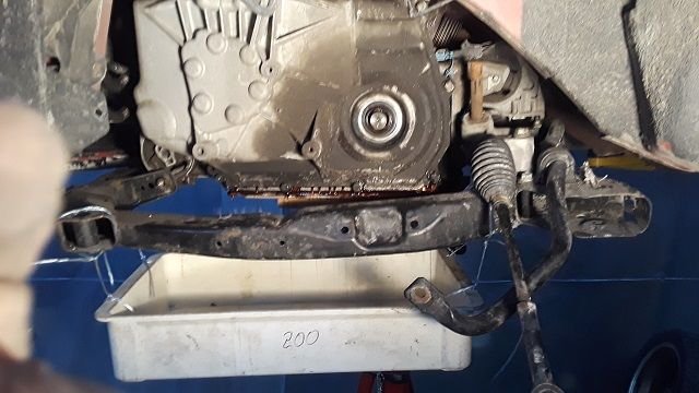 I made a homemade catch pan by hanging a bin box that I had under the transmission cover so it would catch the fluid as it came out: