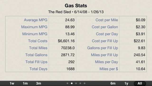 Very nice records. I am amazed and impressed that you were able to average $2.30 per gallon. Looking at Seatles current gas prices they are exactly the same as here in Phoenix and we haven't hit below $2.98 in 2 years. Those early years really helped.