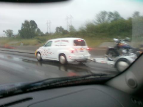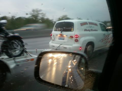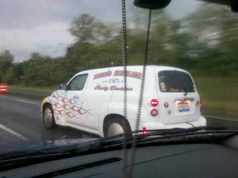 Saw this HHR on the way to work last week. Just remembered that I had the pic on my phone...kinda cool. You'd know it if you saw it. Said "Hawg Hauler" on the side and was trailering a flamed Harley.