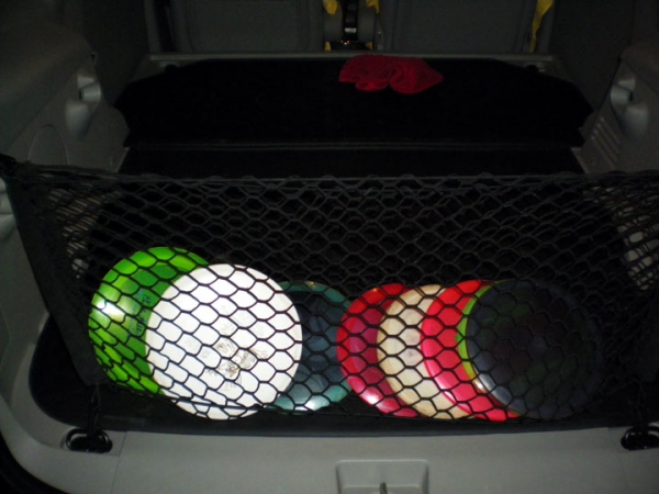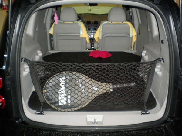 I got groceries tonight & put them into the back storage area above the spare tire. Then netted them in with the clips.