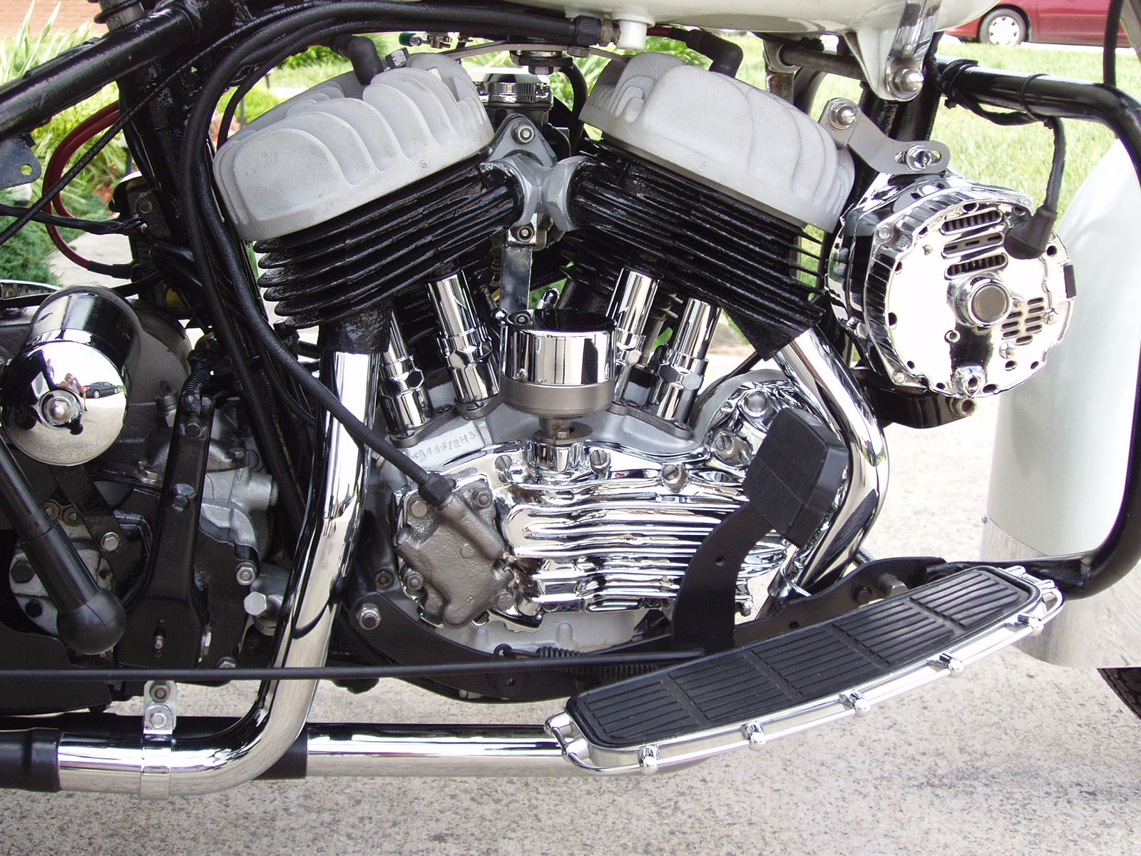 My projects or toys are my bikes. This is my 45 Flatty, bored & stroked to 59"... full tilt build. Jim Leineweber in Cal re-ground the cams for me. Stainless chevy 6 cylinder modded valves. Total Seal Gapless 2nd rings. Hi-Comp heads. Pertronix electronic ign. One of my custom CV carbs, etc, etc. etc. This is the power for my X-Police Servi-Car. And yes the GM alternator was a stock item for it, but this one is a 100 amp "One Wire", I could jump start a dumptruck.