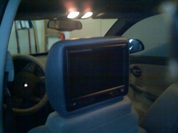 We picked up one at target during christmas for under $70. It attatches to a holded you put on the headrest poles. You can quickly detactch the unit by itself or the whole thing. Comes with a rechargable battery; fm broadcast to play through radio, two small built-in speakers, remote.