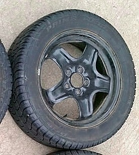 I am in the process of gettin all the stuff together to paint my 5 spoke steelies, lugnuts and hubs gloss black. I love the way they look like old rally wheels. And you cant beat black on silver, and $50-100 depending on the paint or powder coating you use, vs. at least $500 for a decent looking set of alloys. I am also working on a center cap to cover the axle nut in the front and the center of the brake drum in the rear.