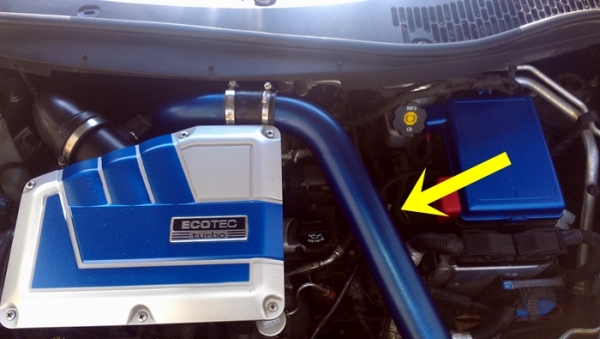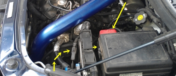 the t-stat is buried under the nest of wires here...the smaller arrows are the coolant hose...