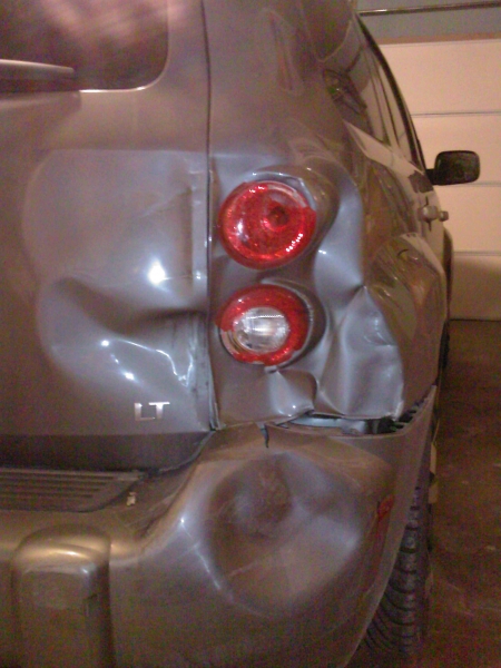 I was able to get slowed down due to traffic on an interstate suddenly coming to a stop practically....the truck coming behind me wasn't so lucky, he looked up just in time to pull it to the right and nail my back corner. He ended up sideways in the interstate but thankfully no injuries. Not sure what insurance is going to say about this as far as cost, 145,000 miles, hail damage....they may just total it out for all I know.