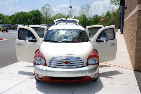 I guess part of the $45K was closing in the far back windows. This isn't a panel because the doors still have windows. I wouldn't have shown it in public until it was buffed and waxed. I really like the style of the wheels but would prefer them in chrome or brushed. Overall, it's a good show car to advertise the HHR.