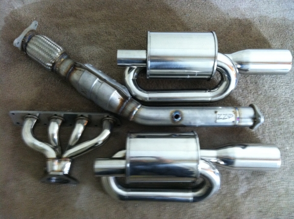 i'm gonna be goin from the header ( equal length 1.71" to 3" collector ), to the 3" downpipe with racing cat, then splitting off after the rear axle from 3" to dual 2.5" twin loop mufflers ( they do fit, i had to try em out ). STILL waiting for ZZP to assemble and ship the supercharger kit.