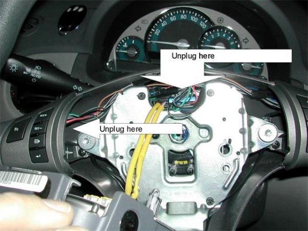 8. Once you have these out, you will be able to remove the harness ends much easier. Have the new harness handy, so you can see the 3 harness ends you need to remove from the steering assembly. The ones that go behind the brackets are a PITA to get through the steering column hole, so cut those hummers off and save yourself a lot of aggravation.