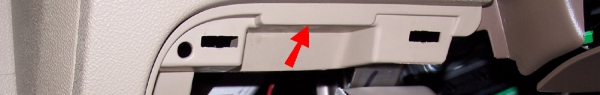 Do some measuring for location and clearance; you can see in the photo where I marked the location on the back of the panel for mine. Make sure you put it low enough to clear the upper dash where it protrudes along the bottom. If you put the unit too high in the panel, it will hit in this area when you try to re-install the panel (see arrow in pic). If by chance you do mount it too high, you can trim a little bit out of that upper dash area, it does get covered up when you put the lower panel back in.
