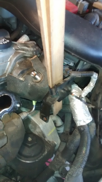 6. There's a Christmas tree/wire harness anchored to the bracket for the air conditioning hard line, towards the driver's side. There was no zip tie on mine like Wired had, you've got to remove the anchor from the bracket. With the wire bundle out of the way a bit, you can now get to the 10mm bolt(with a u-joint)for the bracket.