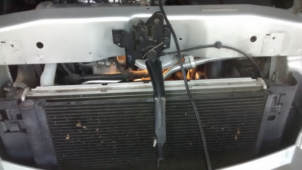 7. Similar situation on the passenger side for the dipstick tube. I had a heck of a time finding this bolt. This time there was a zip tie anchor, you can cut it if you wish, and replace it later, easier than extracting another Christmas tree anchor. The bolt is near the center of the pic. Remove it, 10mm and u-joint. This view is between the radiator and support.