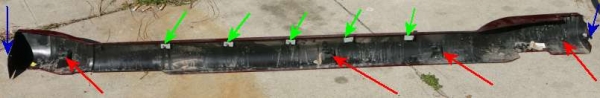 The top picture is of the back of the drivers side, front to the right, sill molding that must be removed. The top clips (green) pop out by putting a wedge between the body and the molding and prying outward.