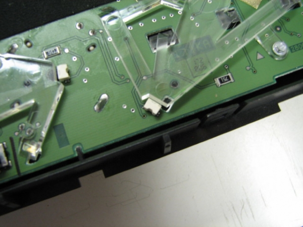1) People wishing to try this modification may encounter something different from what you have documented, i.e. they may wish to delay ordering the LEDs by type and quantity (at least for the radio) until they open it up to see for themselves as to what is needed. This caution may apply to the other components as well, as the manufacturing changes may not apply just to the radio. It seems GM or their supplier has simplified and economized on the construction of the radio from 2007 to 2009; there are less LEDs and less gold plating. I’m going to guess there are ~20 LEDs in the 2007 radio, with the 2009 radio this has been reduced to 5 LEDs. None are located under the knob switches. In the 2009 radio the LEDs transmit the light parallel to the surface of the PCB thru a clear plastic light guide. I believe the LEDs in the 2007 radio transmit light at right angle or perpendicular to the surface of the PCB and there is one LED for each button and knob. The reduction from ~20 LEDs to 5 LEDs is quite a savings, but the two types of LEDs are not interchangeable.