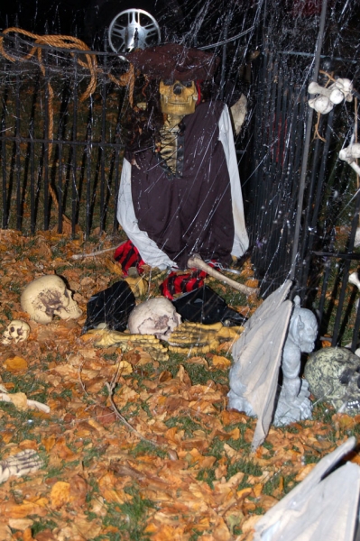 The four corners are Tiki burners in Halloween Design they made a few years back so I fill and light those and the lanterns at the main gate get real candles put in and all are lit at night, so there is actual Fire going on in my displays.