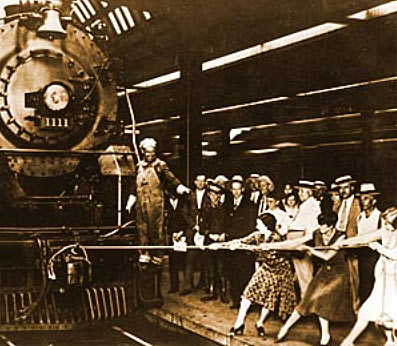1111 (The "Four Aces" 4-8-4 steam locomotive built for the Timken Bearing company by ALCO to demonstrate their roller bearings for railroad use, in this P.R. photo, three ladies pull the 900,000lb locomotive with "little effort" at Chicago)