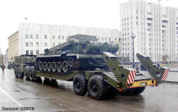 Similar mastodons sometimes cruising under my windows at night. They drag self-propelled guns or tanks on Transmash for repair and tuning. Rail diesel boomed so that the dishes ringing in the closet.