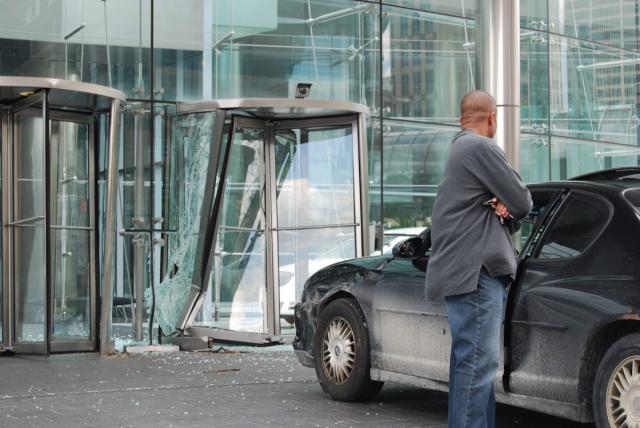 A mentally disturbed man crashed his Monte Carlo into GM headquarters yesterday afternoon, at the moment he is in police custody, and there were no injuries except the the lobby of the Renaissance Center.