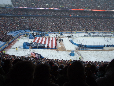Those of you in warmer climes won't appreciate this, but for northerners and Canadians January 1, 2008 will go down in history as the day the largest crowd to attend an NHL hockey game filled Ralph Wilson Stadium (home of the Buffalo Bills). It was the Winter Classic, or more popularly known in these parts as the Ice Bowl. As a long time fan of the game, I just had to be there and managed to score a couple primo club level seats so that my sons and I could be part of the fun. It was without a doubt a once in a lifetime event that more than lived up to the hype. My beloved Buffalo Sabres lost in a shoot-out to the Pittsburgh Penguins but somehow the final score really didn't matter much to me. Here's a few pics I took to give you a little bit of an idea how it looked.