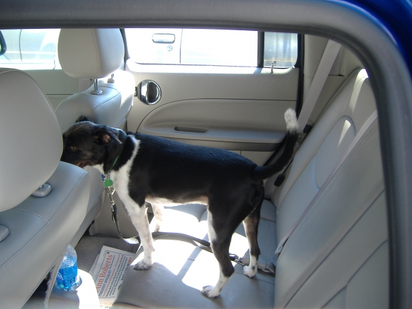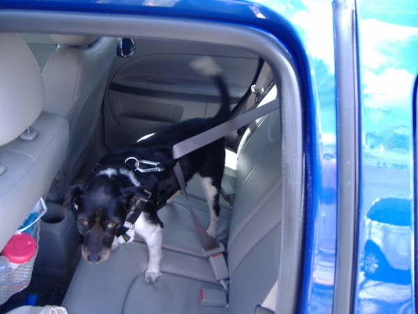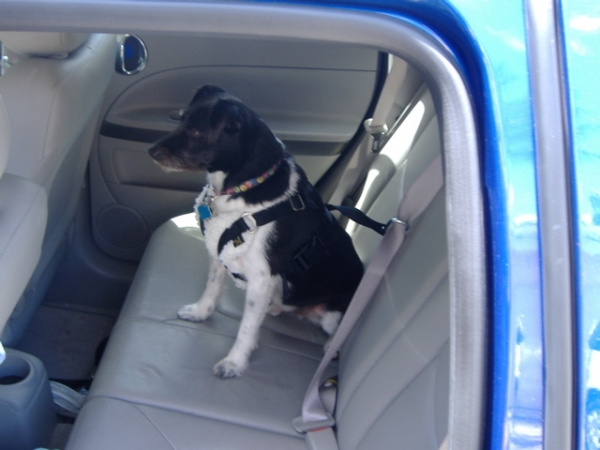 I think he would prefer the freedom of the harness clipped to the seatbelt. He loves standing with his front paws on the armrests. But the last shot, he was actually wagging his tail!