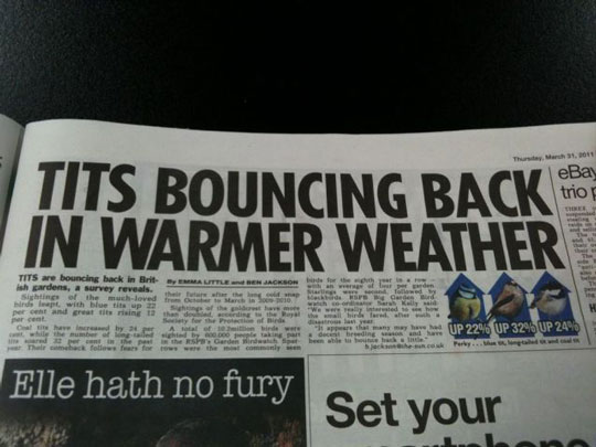 Yes, nothing better than a garden full of bouncing tits. Unless they are on your baby sitter He looks pretty excited about it, is he thinking " wow all you can eat" ??