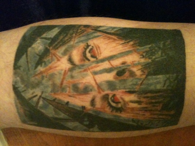 Guys trip to Orlando FL one summer Drunk as hell from the night before some how figured it would be a good idea to get a tattoo. Told the guy to draw up something cool that he doesn't do everyday. I liked this: