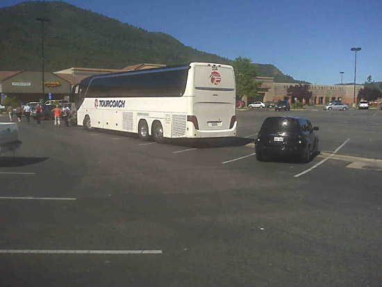 You can see that I parked 7 spaces away from the nearest car in my row. And the parking lot is 90% empty. But this tour bus clown parallel parks between me and the jeep in front of him--and he's even closer to the jeep! Unbelievable.