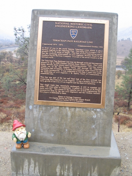 The Tehachapi Pass Railroad Line was cut through solid and decomposed granite by up to 3000 Chinese laborers from Canton China. They used picks, shovels, horse drawn carts and blasting powder. This line, which climbs out of the San Joaquin Valley and through the Tehachapi Mountains had 18 tunnels, 10 bridges and numerous water towers for the old steam locomotives. It was completed in less than 2 years time under the leadership of civil engineer J. B. Harris, Chief of Construction, a remarkable feat.