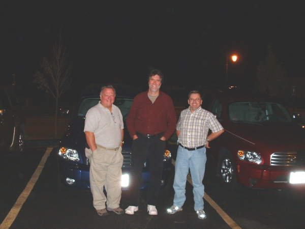 Tom aka TomsHHR has arrived in Massachusetts. He's in the Worcester area conducting training for his company. We had a little "get together" with another member, Chris aka four61ob, and my wife. We all met at the Picadilly Pub located on one of the seven hills of Worcester. This area overlooks the University of Mass Medical School as well as the UMass/Memorial Medical and Trauma Center. While driving up busy Route 9, my wife and I spotted a wild turkey standing on the sidewalk near the medical school bus stop. We were so surprised that we never got a photo! Sort of made me nervous knowing how wild animals gravitate towards Tom. We all met in the parking lot, made our introductions, and snapped a few car photos before it got dark. Tom is driving a sandstone HHR rental while he's here. Darn...I was hoping to see the Deerslayer! Chris has a Daytona Blue 2LT. Nice rig with the sunroof. Even my wife liked it. Once inside we got a drink while we waited to be seated, and chatted about everything. During the meal the conversations actually did touch on HHRs, car racing, (Chris is hot for NASCAR), and everything in between. My wife (who dreaded going because she thought all the talk would be about cars) was right into the jabber with both. She got a couple of mugshots of us in the parking lot before we split up. Everyone but me has to be up early (one of the few pleasantries of being retired ). The food was good, the conversation great. I know Tom has met a few of you, but I think everyone should meet him and Chris. They are both great guys who happen to drive great cars! Pics are in the gallery.