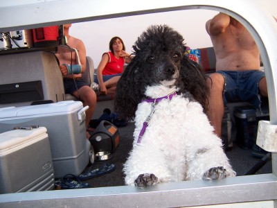 Here is my little black and white poodle doing what she loves best, riding in the boat. I have two black and white poodles one white poodle and three cream and white puppies.