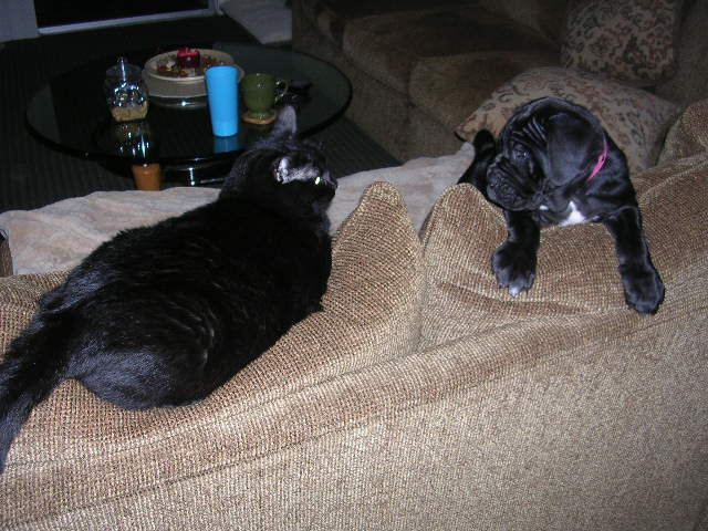 lucy is the new kid on the block , shes 5 months, and gaining lbs, we are hoping for 150 to 160 , are last two were 185 & 150 , the pic with the cat she was darla we just lost her to a heart blow out , found her in the drive way doa, looking for a new kitten for the wife hoping to name hhr, ?