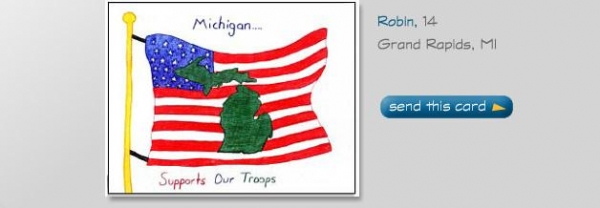 These postcards will be sent to military men and women all over the world. It's free and it's just a way of saying thanks. The cards show the name of the child that created them and their age. You can then select a message and it will be sent. Although you can't choose who you are sending it to, it really shouldn't matter.