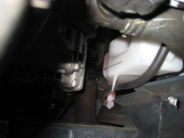 And Sidecardog1's explanation: "This photo is looking down at the rear side of the coolant recovery tank. Look down at the rear side of the SS coolant recovery tank and on the rear side about 3 inches up from the bottom of the assembly there is a horizontal protrusion. The arrow in the photo points to this. It looks like a "rib" on the tank running left to right along the tanks rear side. The owners manual indicates this in a somewhat confusing manner. When the engine is cold the pink coolant should be at or slightly above the rib. The photo is from a 2010 SS with 5spd."