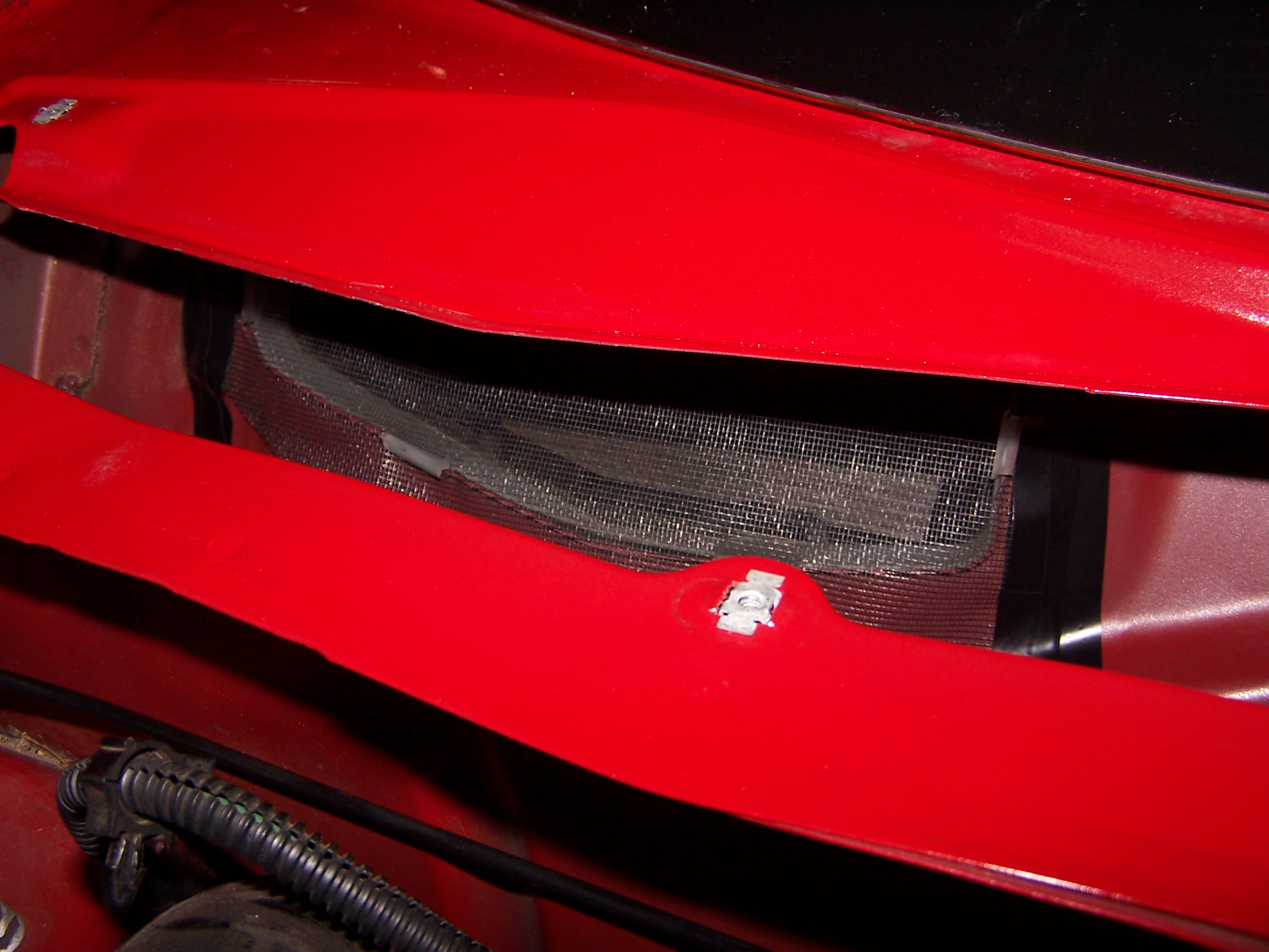 So, today I took off the cowl cover again and put a piece of plastic mesh screen over the hole. It's just taped down with added attachment from those plastic lock tabs around the hole. Cut a small slit in the screen at the tab locations.