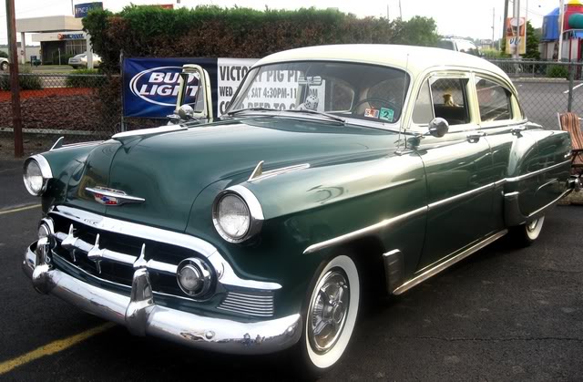 I dig the 53-54 chevys also.. my 1st ride was a 53 Two-Ten Deluxe..(not the one in the pic, but same colors & a 2 door).. 235" straight 6...