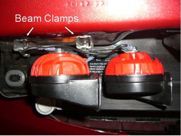 The horns are bolted to beam clamps shown here. The beam clamps are attached to the radiator core support.